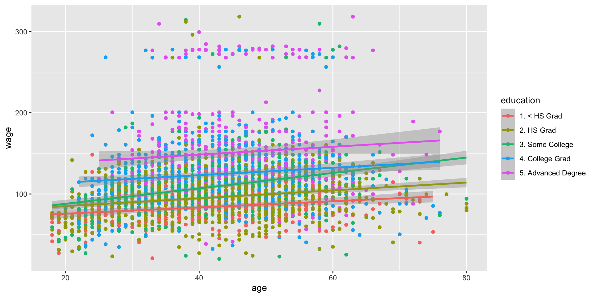 Example: Wage has \(n\)=3000 observations (i.e. male workers in the Mid-Atlantic region) and \(p\)= 11 variables1: year, age, maritl, race, education, region, jobclass, health, health_ins, logwage, wage.