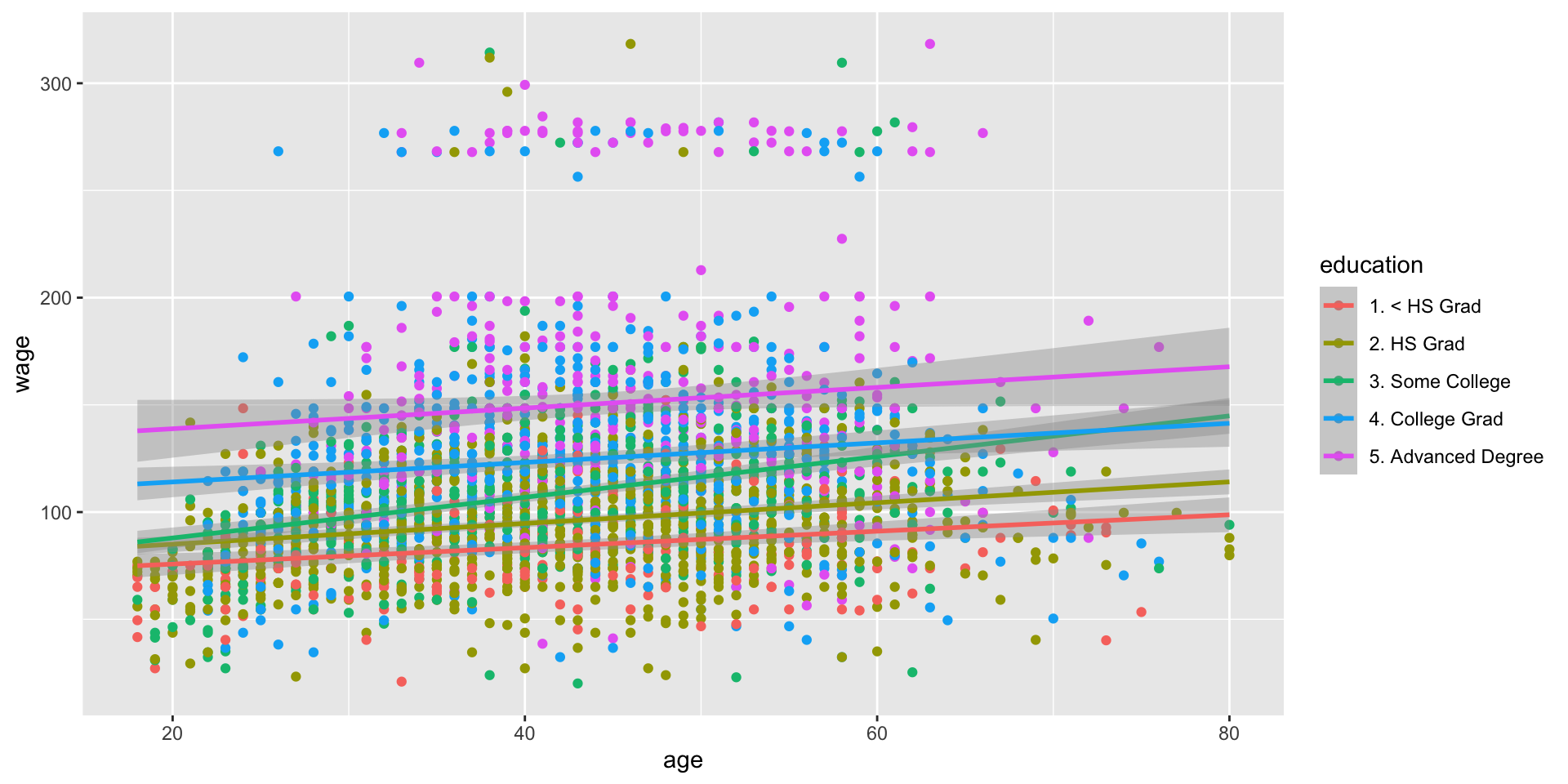 eg. using the Wage data set we might consider the input variables: \(X = (X_1, X_2)\) where \(X_1\)= year and \(X_2\)= age and response variable \(Y\) = wage.