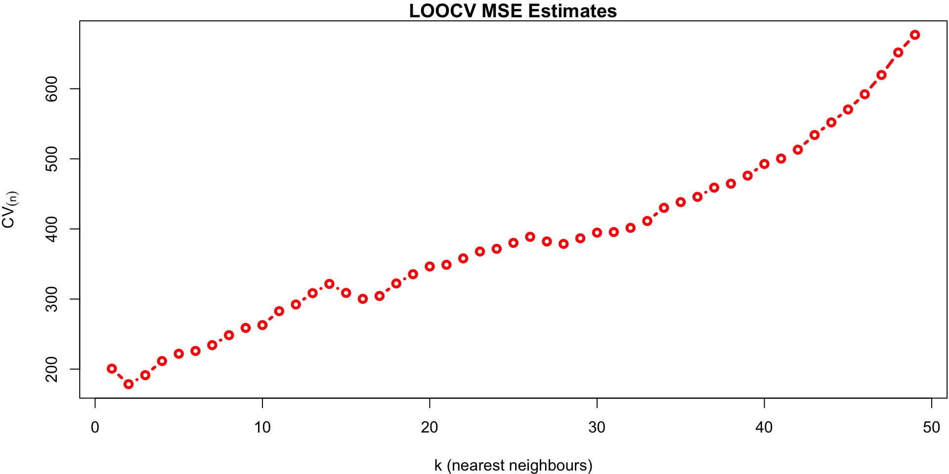 In this case k = 2 KNN model gets a CV MSE estimate of 178.54 hence is suggested as the better model.