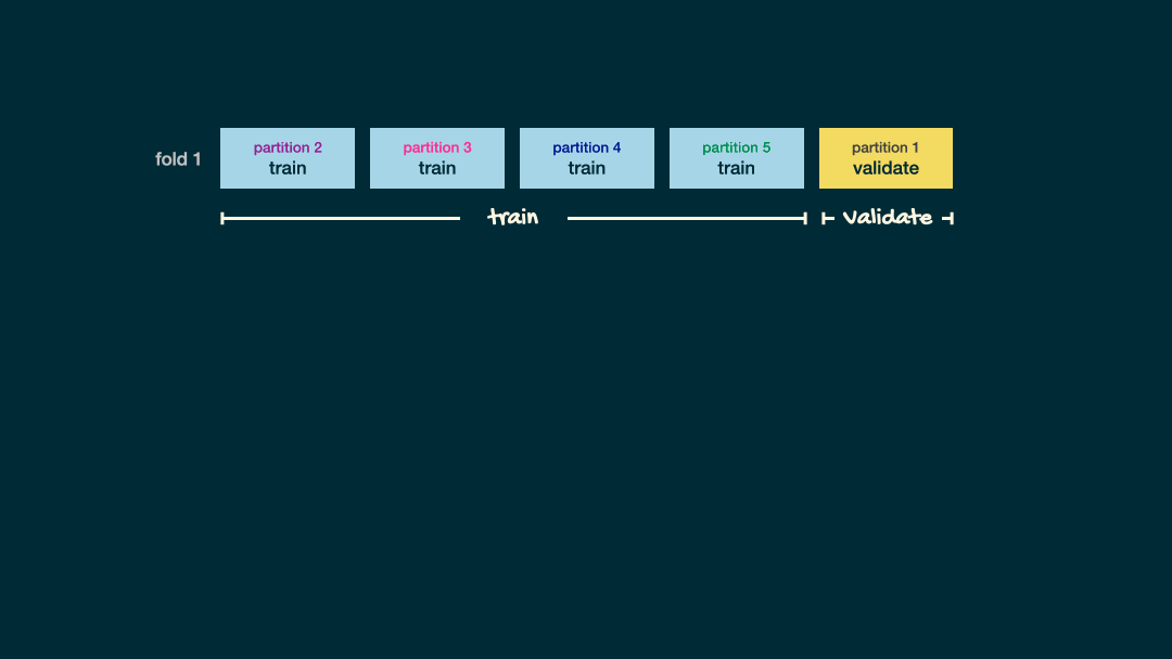 Depiction of 5-fold cross validation. Note that the data would be shuffled before creating these folds. Source Sec 6.6.1