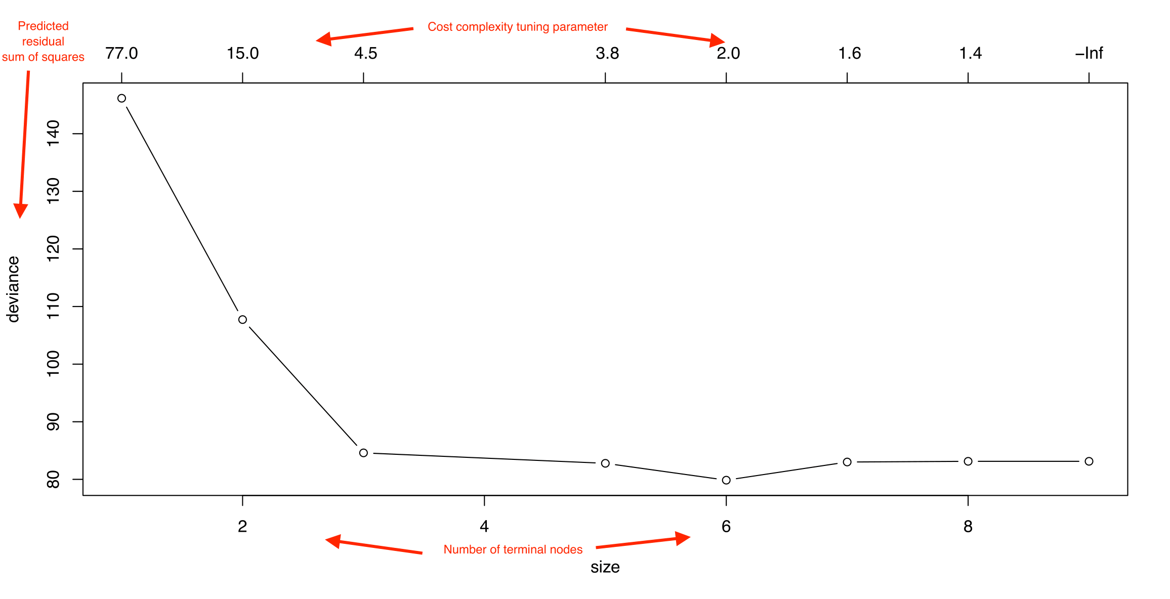 We consider a sequence of trees indexed by a non-negative tuning parameter \(\alpha\). For every value of \(\alpha\) there corresponds a subtree, \(T \in T_0\), such that the following is minimized: \[\begin{equation} \sum_{m=1}^{|T|} \sum_{i:x_i \in R_m} (y_i - \hat y_{R_m})^2 + \alpha |T| \end{equation}\]