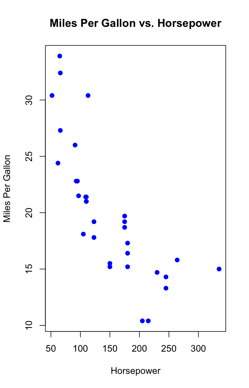 Figure 1: Scatter plot of Miles Per Gallon vs. Horsepower