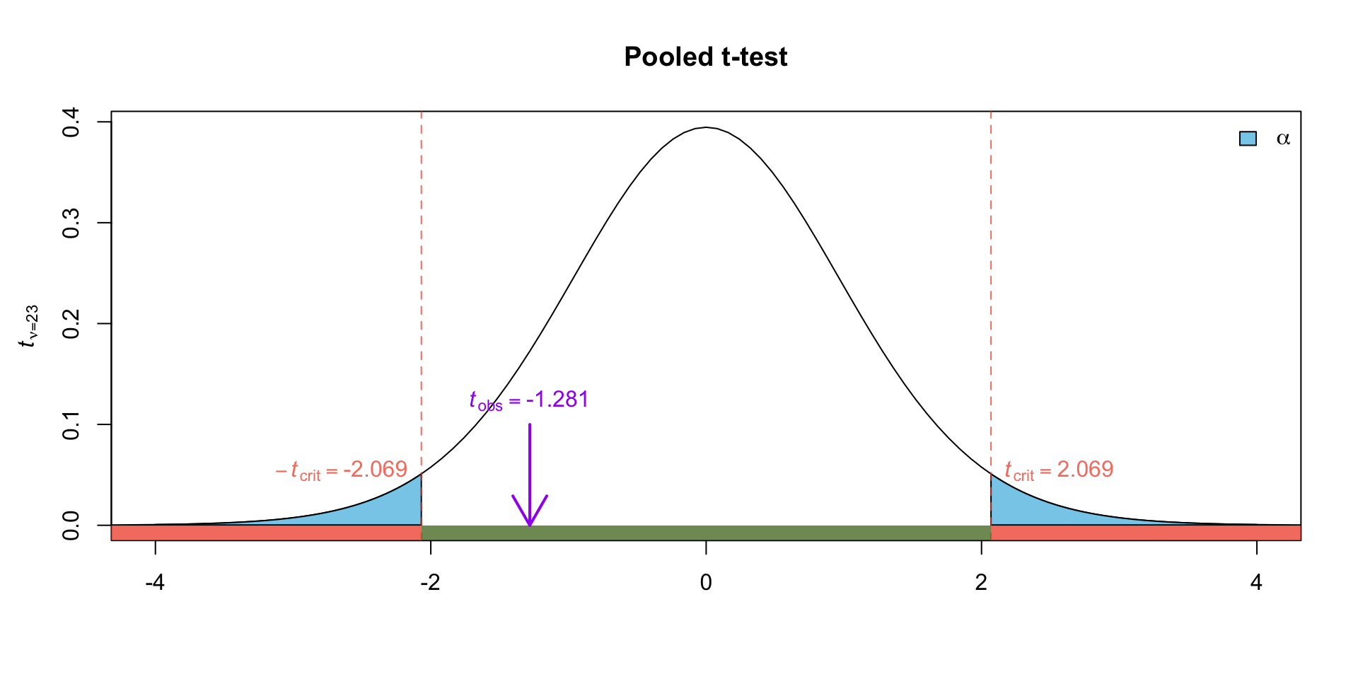 t_{obs} =\dfrac{246.43 - 276.91}{59.0544479\sqrt{\frac{1}{14} + \frac{1}{11}}} \approx -1.281