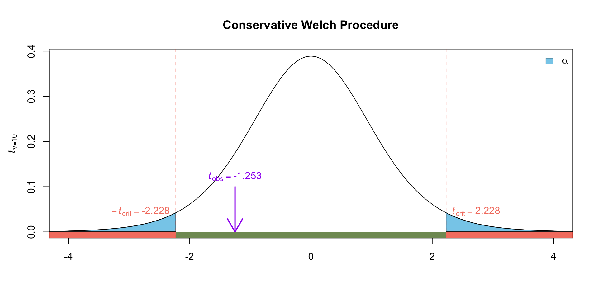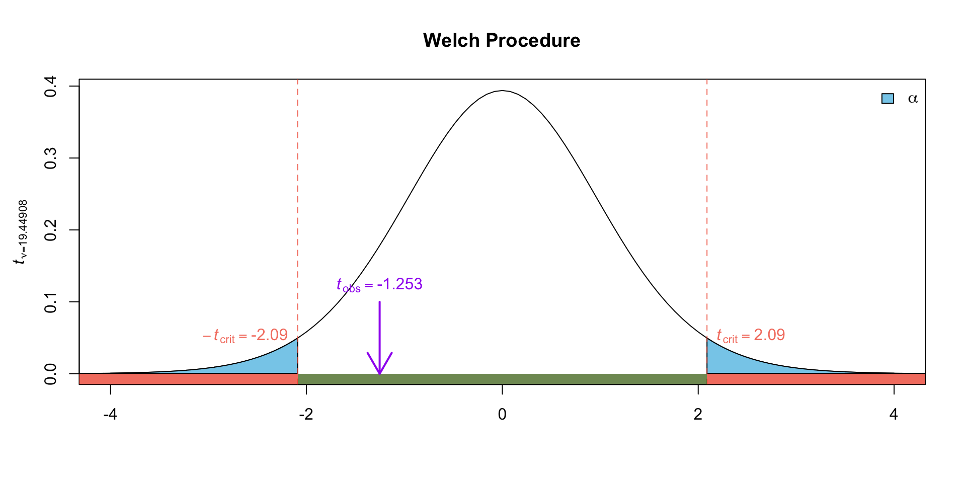Recall, however, that the Welch procedure is only an approximate procedure. Hence, you should perform the exact pooled \(t\)-test instead whenever appropriate.
