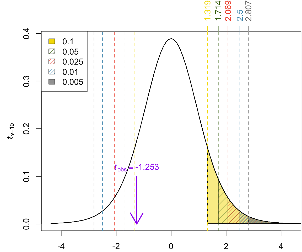We can find the approximate \(p\)-value using the t-table with the conservative df \(\tilde \nu_w = 10\)\[\begin{align}